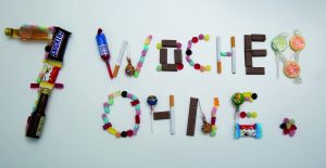 Schriftzug „7 Wochen ohne“ aus Süßigkeiten und Genußmitteln